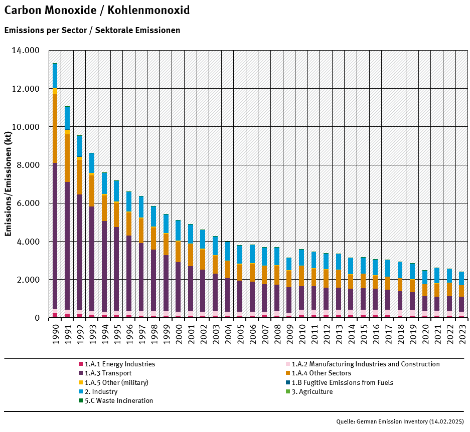 Table: Carbon monoxide emissions 1990-2023, in kilotonnes [kt]
