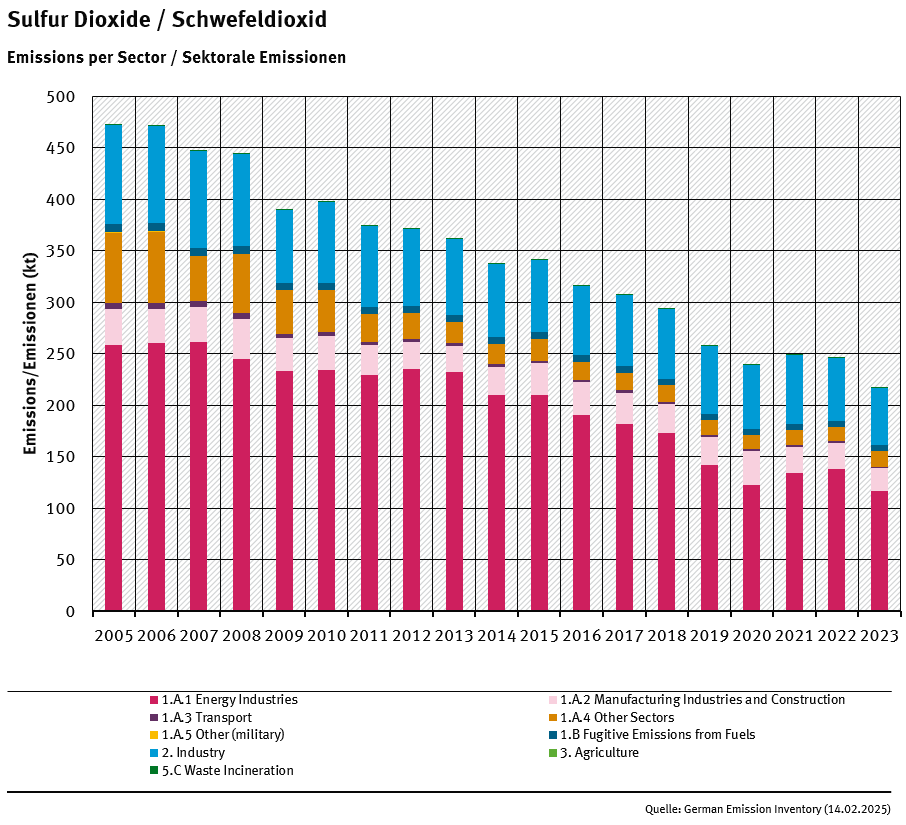 All of these sub-categories show a reduction >95 per cent between 1990 and 2023, due to stricter regulations of West Germany that applied to the New German Länder after the German Reunification and changed the fuel mix from sulphur-rich solid fuels to liquid and gaseous fuels.