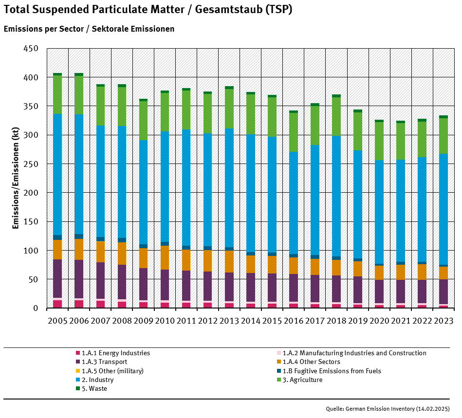 Between 1990 and 2023, total TSP emissions dropped by 83.5%, mainly due to stricter regulations of the Old West Germany that applied to the New German Länder after the German Reunification and realized a change-over from solid to gaseous and liquid fuel, as well as advancements in filter technologies of combustion plants and industrial processes.