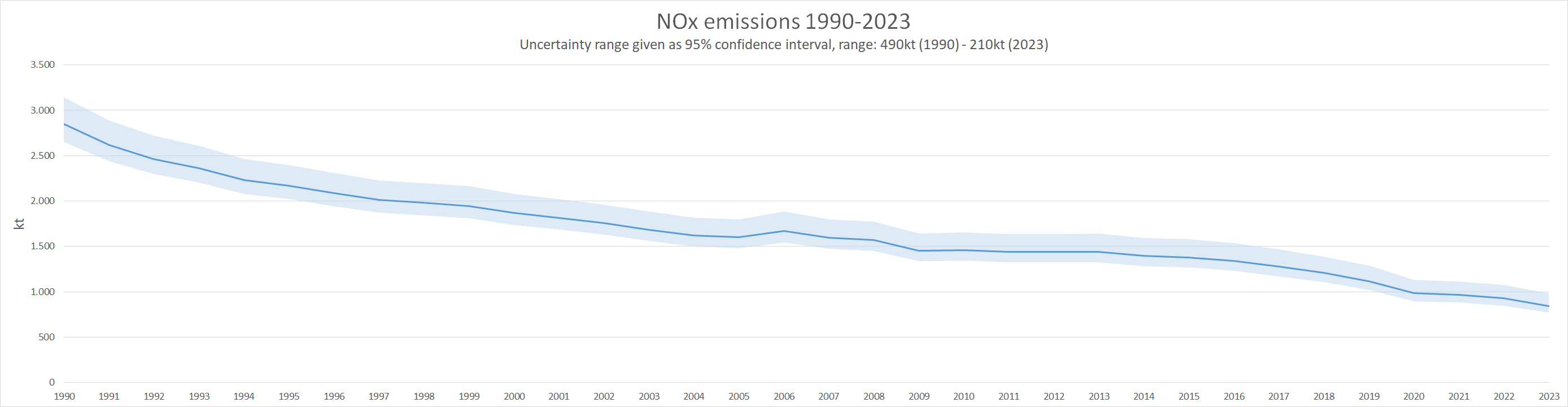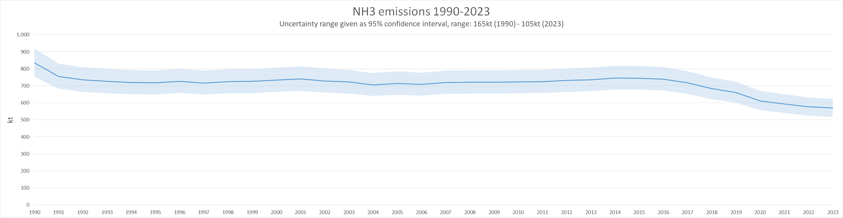 Uncertainty in the NH3 emission national total is moderate and mainly caused by agriculture sources, in particular 3.D.a.2.a - Animal manure applied to soils. 3.B.3 - Manure management - Swine, 3.B - Manure Management - Dairy cattle and 3.D.a.1 - Inorganic N-fertilizers do also play significant roles. The national total has a 95% confidence interval of about -8.9% to +9.5% in 2023, which amounts to about 105kt of NH3. You can drive your own analysis with the numbers found in the spreadsheet file attached.