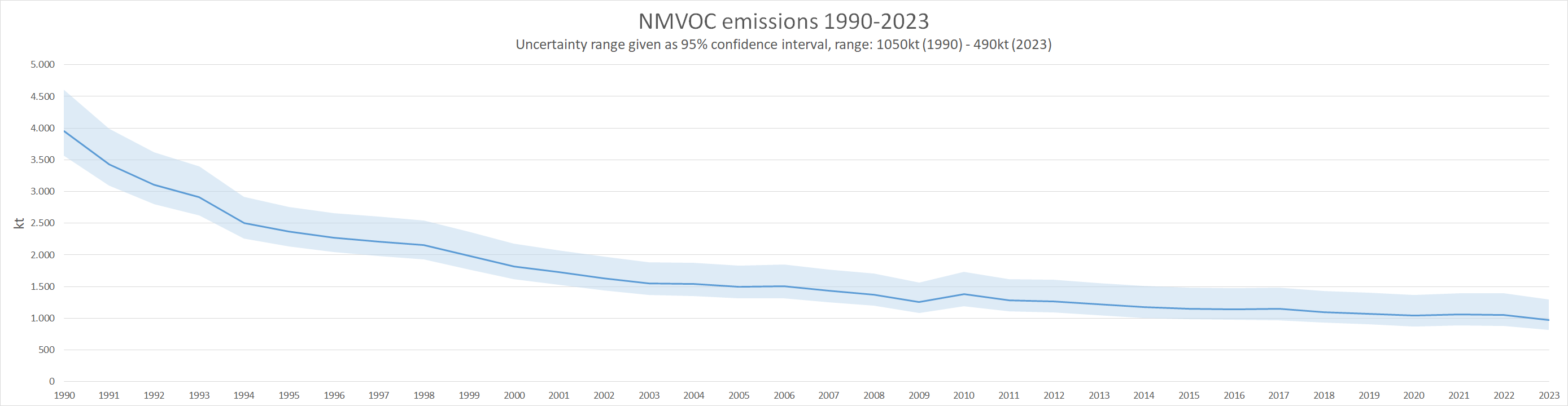 NMVOC emissions and trends are driven by solvent use. While solvent contents of most products are well known, application context and use statistics introduce significant model error bars. Agriculture emissions of NMVOC are, while not very high in value, very uncertain and also contribute to the overall error margins. In sum, NMVOC emissions show moderate to high uncertainty. The national total has a 95% confidence interval of about -16.7% to +33.1% in 2023, which amounts to about 490kt of NMVOC. In order of significance, the top five contributors are 3.B - Manure Management - Dairy cattle, 3.B.1.b Manure management - Non-dairy cattle, 2.D.3.a - Domestic Solvent Use, including Fungicides, 1.A.4.b.i - Residential: Stationary Combustion as well as 2.D.3.d - Coating Application. As with the other pollutants, details are to be found in the spreadsheet file.