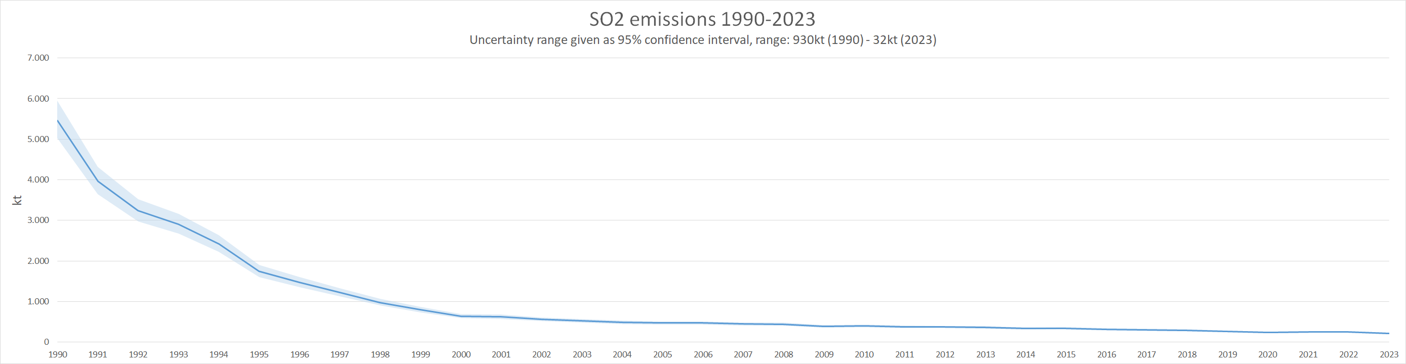 SO2 emissions are mainly emitted by stationary combustion plants. Since those are heavily regulated and fuel sulphur contents are generally well known, uncertainties in SO2 emissions are low. The national total has a 95% confidence interval of about -6.9% to +7.2% in 2023, which amounts to about 32kt of SO2. The top contributing sector to the SO2 uncertainties is 1.A.1.a - Public Electricity And Heat Production, followed by a rather big margin by 1.A.1.b - Petroleum Refining, 1.A.4.b i - Residential: Stationary Combustion, as well as 2.C.1 - Iron and Steel Production. All data is available in the spreadsheet file.