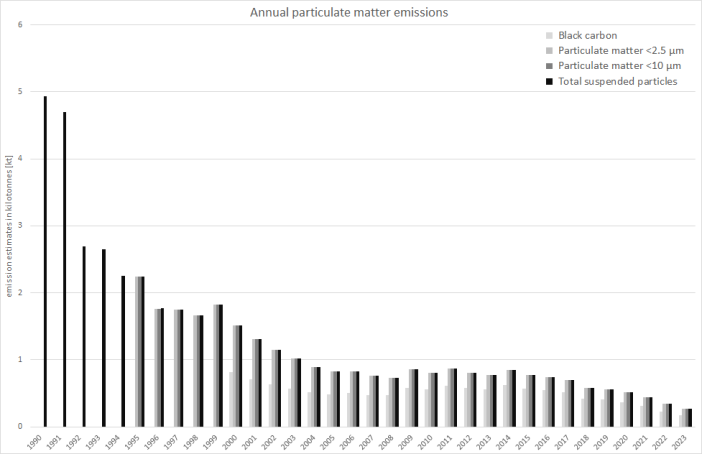 Over-all PM emissions are by far dominated by emissions from diesel oil combustion with the falling trend basically following the decline in fuel consumption between 2000 and 2005. Nonetheless, the decrease of the over-all emission trend was and still is amplified by the expanding use of particle filters especially to eliminate soot emissions.