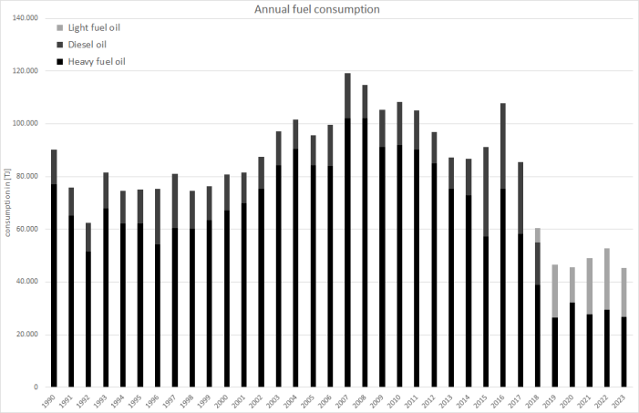 Furthermore, after 2014, with ever stricter legislation espacially regarding fuel sulphur content, an ongoing shift from heavy fuel oil to maritime diesel oil can be observed.