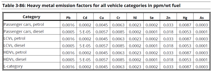 For information on the emission factors for heavy-metal and POP exhaust emissions, please refer to Appendix 2.3 - Heavy Metal (HM) exhaust emissions from mobile sources and Appendix 2.4 - Persistent Organic Pollutant (POP) exhaust emissions from mobile sources.