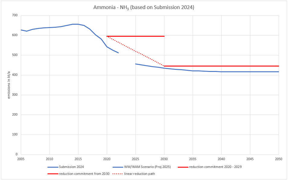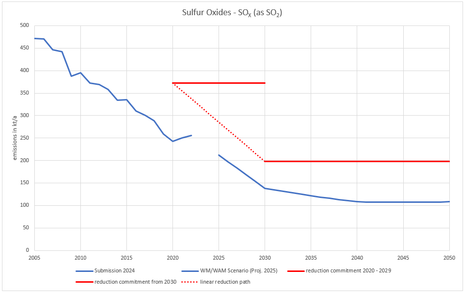The following figures show the developments for each pollutant in the WM and WAM scenarios (WAM only for NOX and PM2.5 as there are no differences between both scenarios for all other pollutants). In addition, the reduction commitments for 2020 to 2029 and from 2030 onwards as well as the indicative linear reduction path are shown. Please note that projected emissions were only calculated for the years 2025, 2030, 2035, 2040, 2045 and 2050. A linear reduction in the years between cannot be assumed, but is shown in the graphs just for illustrative reasons.