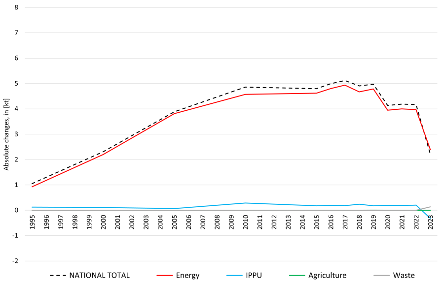 Changes within the National Total reported for 1995 (-9.7 kt | -2.7 %) are dominated by changes in NFR 2.G (- 8.81 kt or -58.7 %) together with less significant revisions throughout NFRs 1, 2 and 3.
