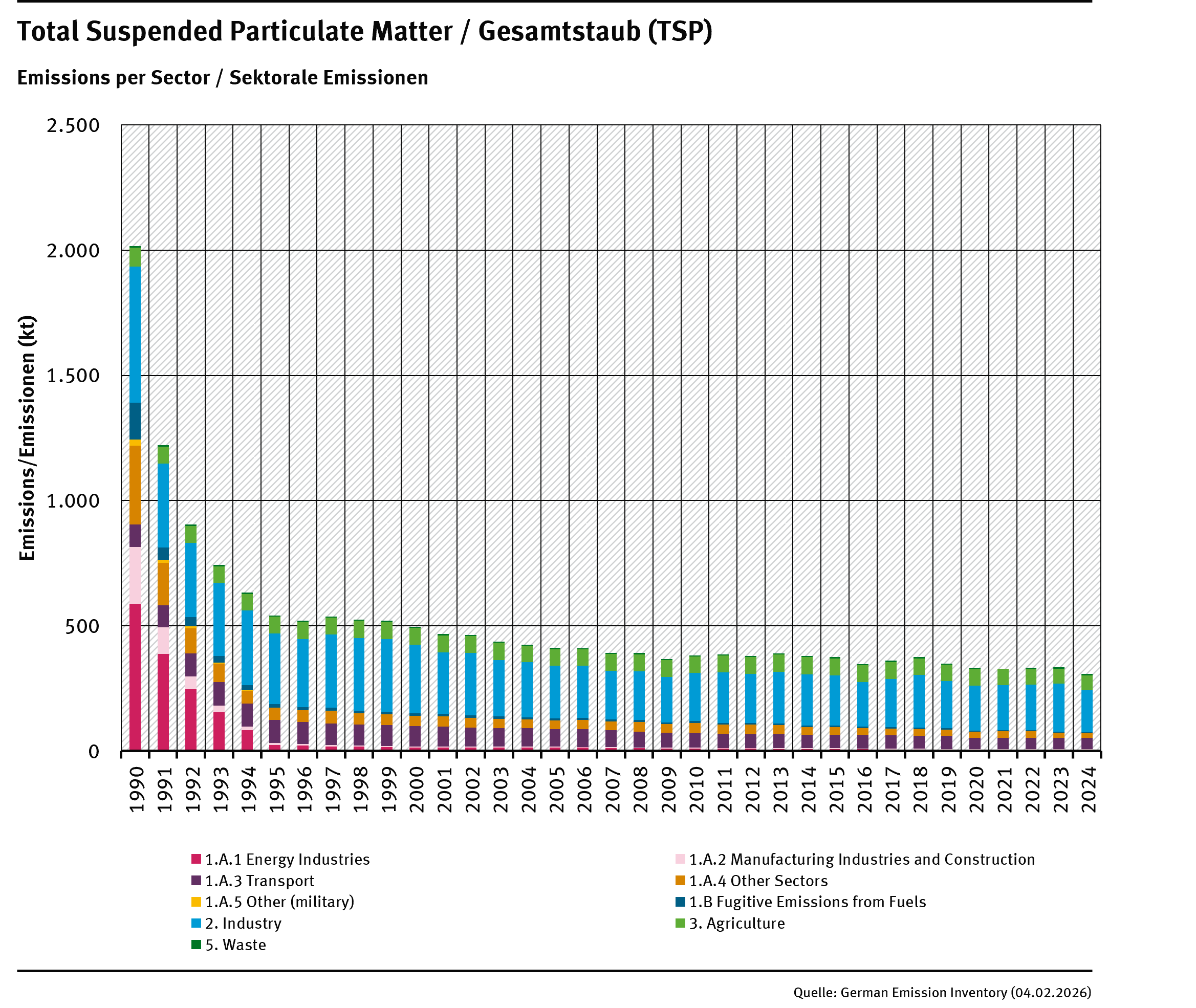 Between 1990 and 2024, total TSP emissions dropped by 84.7%, mainly due to stricter regulations of the Old West Germany that applied to the New German Länder after the German Reunification and realized a change-over from solid to gaseous and liquid fuel, as well as advancements in filter technologies of combustion plants and industrial processes.