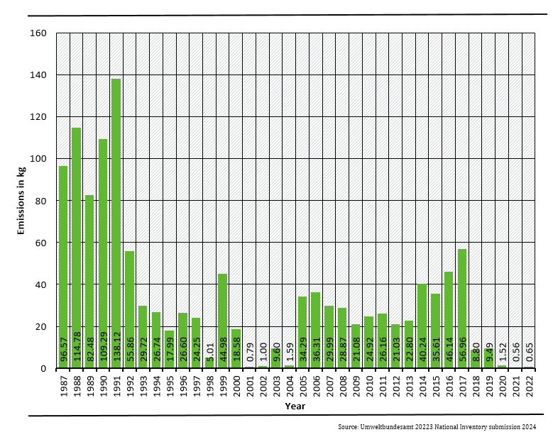 The following chart give an overview of the emission trend of HCB (see Picture 1). HCB emissions were fully recalculated from 1987 onwards including atrazine, simazine, propazine and quintozine. HCB emissions are reported in the NFR tables beginning in 1990.