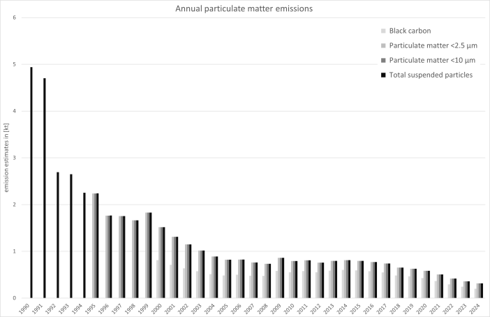 Over-all PM emissions are by far dominated by emissions from diesel oil combustion with the falling trend basically following the decline in fuel consumption between 2000 and 2005. Nonetheless, the decrease of the over-all emission trend was and still is amplified by the expanding use of particle filters especially to eliminate soot emissions.