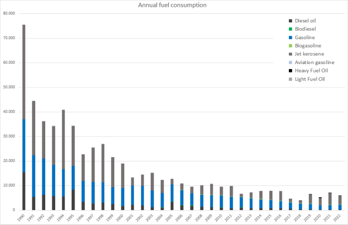 As the “consumption data” provided here originally represents fuel delivery data, some trends in “annual consumption” are influenced by stock-keeping activities. Here, a clear impact of storage effects can be observed for avgas, where a significantly high amount of 15 TJ was purchased in 2007 followed by zero or very small deliveries.