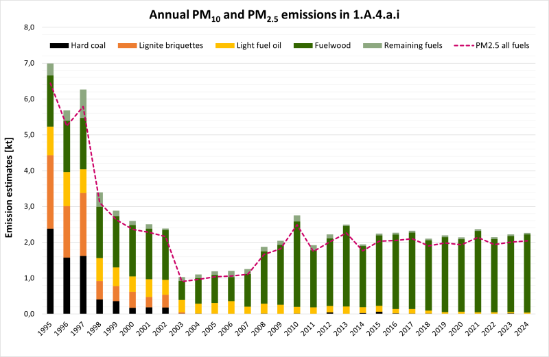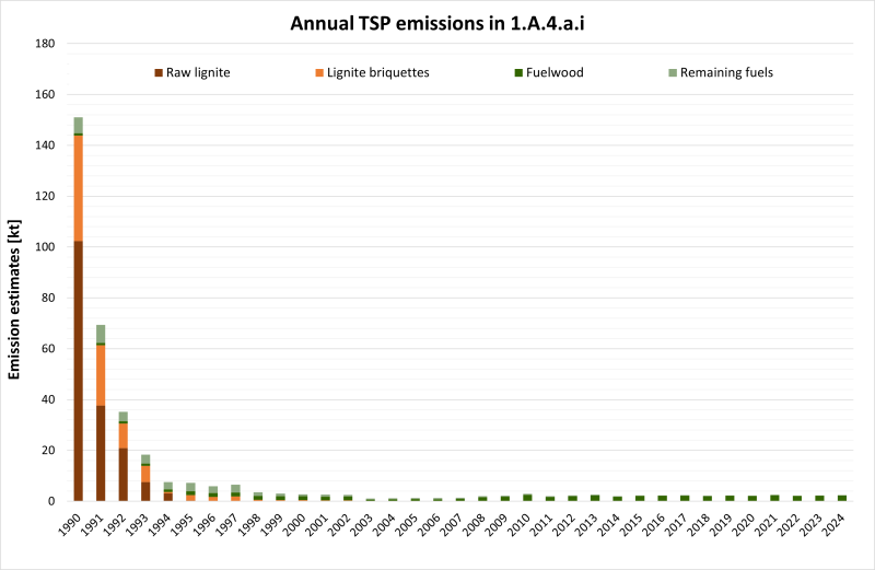 The emission trends for PM2.5, PM10, and TSP are also influenced severely by decreasing coal consumption in small combustion plants, particularly in the period from 1990 to 1994. Since 1995 the emission trend hardly changed. Increasing emissions in the last years are caused by the rising wood combustion.