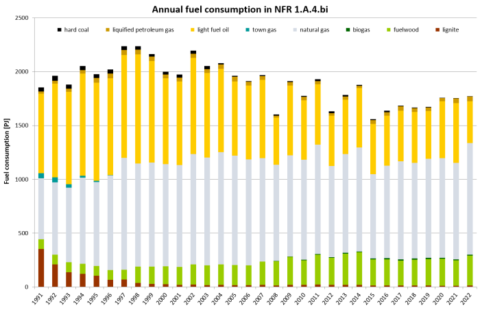 Annual fluctuations of all fuel types in source category 1.A.4.b.i depend on heat demand subject to winter temperatures. Between 1990 and 2002 the fuel use changed considerably from coal & lignite to natural gas. The consumption of light heating oil decreased as well. As the activity data for light heating oil is based on the sold amount, it fluctuates due to fuel prices and changing storage amounts. In 2010 and 2013 fuel consumption was particularly high due to the cold winter. The higher fuel consumption in 2014 - 2017 is a result of lower temperatures during the heating period. In 2019 and 2020 the fuel demand increased due to decreasing oil prices, and therefore less in 2021.