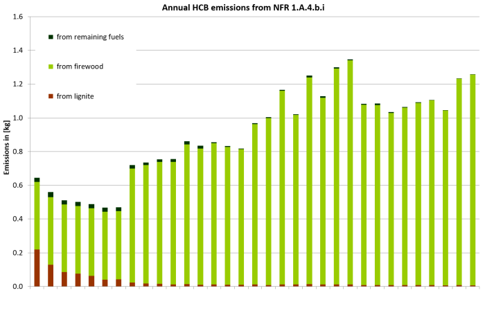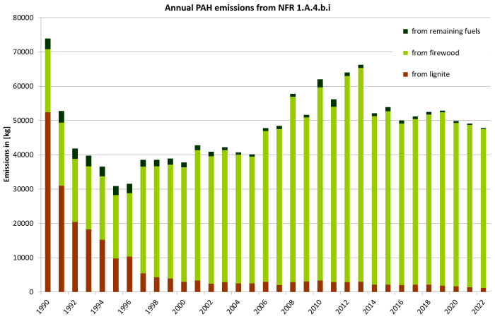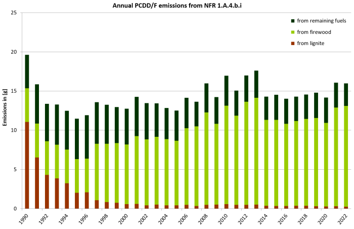 The main driver of the POP emission trend are coal and fuelwood combustion. PCDD/F emissions from coal fired furnaces are declining but the effect is retarded by increasing wood consumption. The same influencing variables apply accordingly to the PAH emission trends. The emission trend of HCB shows a high dominance of emissions from wood-burning. Emission factors for HCB are constant from 1990 to 2020. Furthermore, the difference between the EFs for coal and fuelwood is very big. Therefore, the emission trend depends solely on the development of fuelwood consumption. Regarding HCB emissions the inventory is incomplete. This is one of the reasons for the importance of emissions from small combustion plants. In 2010, 2012 and 2013 emissions are particularly high because of the cold winter. It's known that in spite of the existing legislation, an unknown quantity of waste wood is illegally burnt. However, it's impossible to ascertain the fuel quantity, since the use of waste wood for heating purposes in small combustion plants is illegal. Therefore all emission factors and emissions refer to the use of untreated wood.