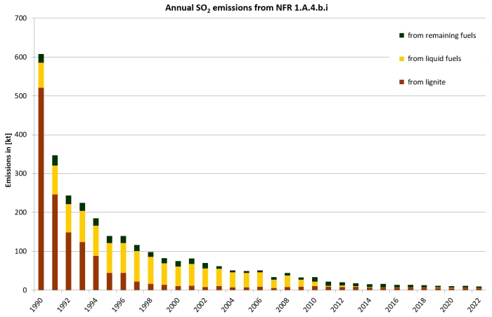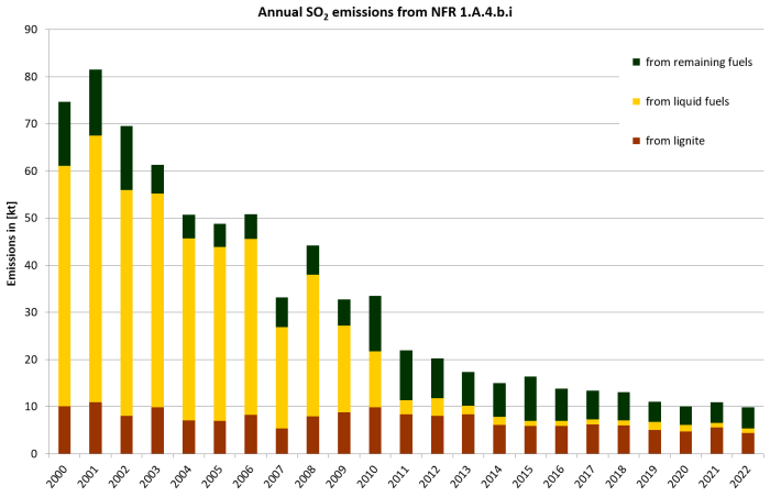 SO2 emissions decrease due to the fuel switch from coal (especially lignite with a high emission factor) to natural gas with a lower emission factor. A further SO2 reduction from 2008 onwards can be explained by the increasing use of low-sulfur fuel oil. Nowadays almost exclusively low-sulfur fuel oil is used. In contrast to SO2 emissions NOX emission trend is less influenced by fuel characteristics but more by combustion conditions. Therefore NOX emission values shows lower reduction. During the last years the use of firewood gain influence.