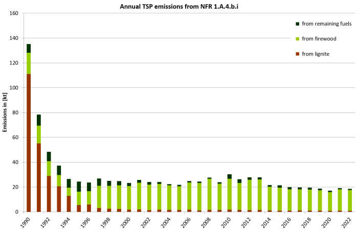 The emission trend for PM2.5, PM10, and TSP are also influenced severely by decreasing coal consumption in small combustion plants, particularly in the period from 1990 to 1994. Since 1995 the emission trend didn't change hardly. Increasing emissions in the last years are caused by the rising wood combustion in residential fire places and stoves.