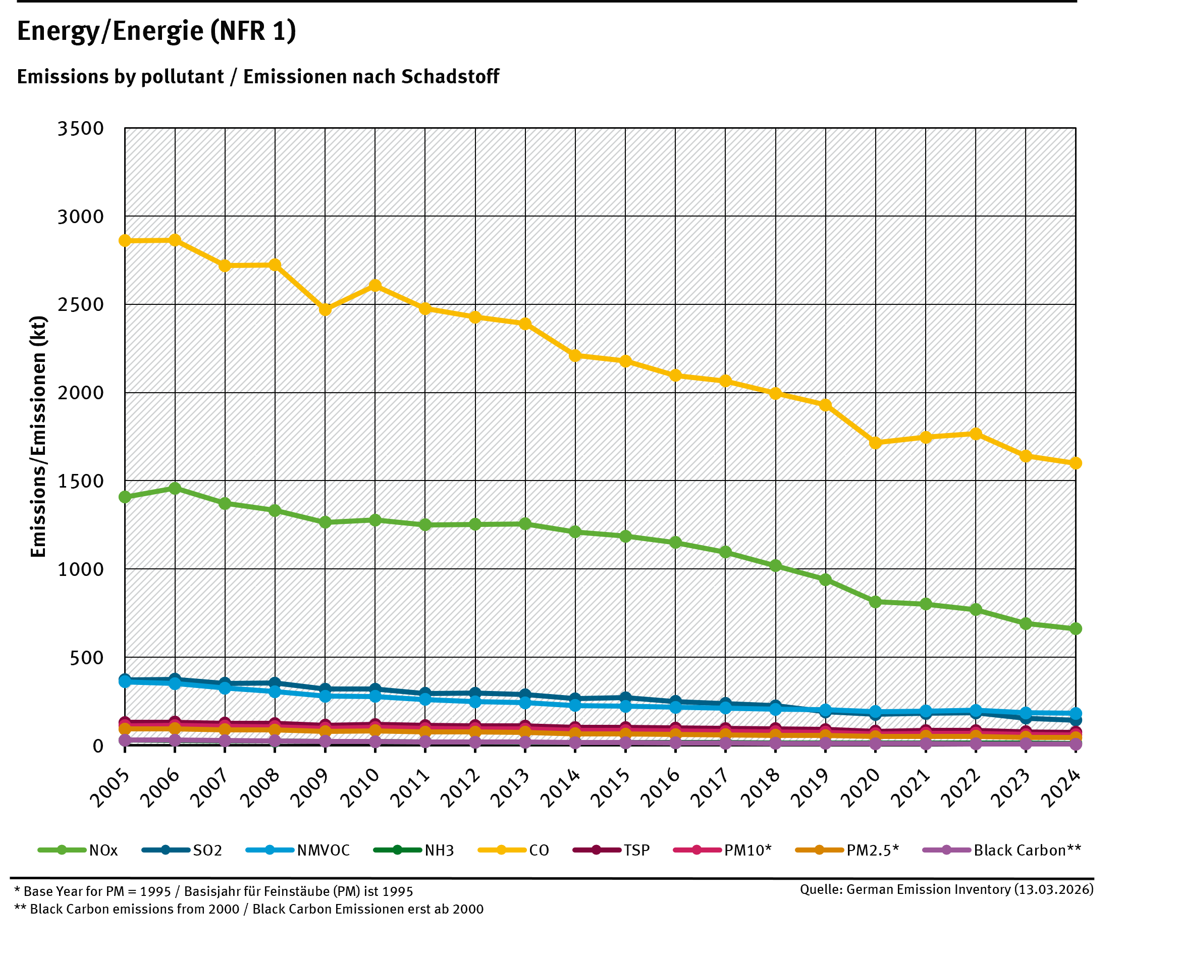 Energy and heat generation constitute the most important sources of emissions in Germany. This holds true for almost every pollutant (a prominent exception of this rule being ammonia, mainly from agriculture). Consequently, this section will look into the sub-sectors making up the NFR 1 - Energy sector with great detail. For overview information on key activity statistics and the basis for fuel based estimates please refer to Chapter 1.4 - Methods and Data Sources.