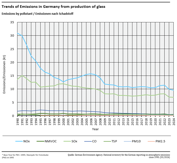 The procedure used to determine emission factors for the various glass types involved and the pertinent emissions is described in detail in reports of two research projects (2008: Report-No. 0012641), 2021: Texte 45/20212)). The emission factors were calculated for the various industry sectors. The factors vary over time in keeping with industry monitoring, not only as steady trends, but falling in most cases. The most recently EF are for different glass types the following: