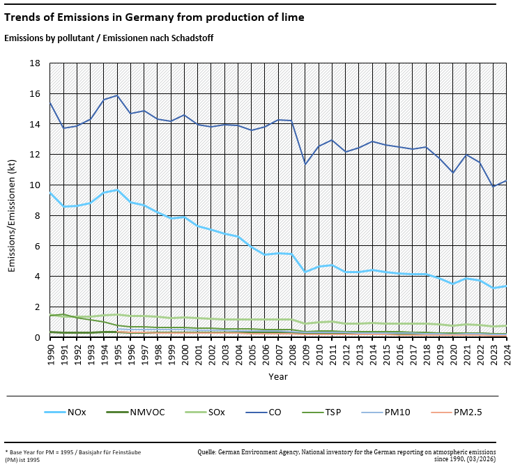 Most companies are also required to report lime-production data within the framework of CO2 emissions trading. The EU monitoring guidelines for emissions trading specify a maximum accuracy of 2.5%. It is additionally assumed that 2% of the burnt lime is separated as dust in all years as of 1990 via appropriate exhaust gas purification systems and is not returned to the production process. This is taken into account by a potential 2% increase in activity rates.